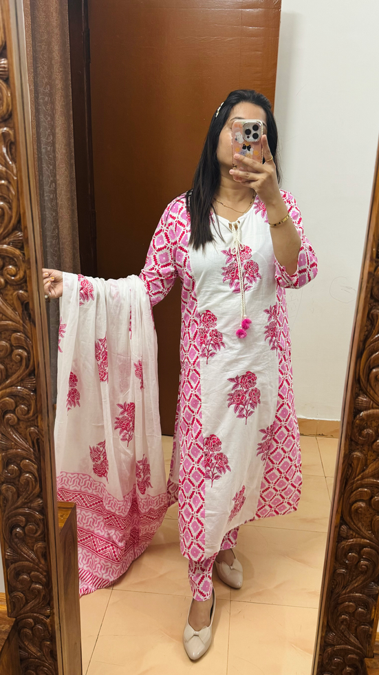 Designer BlockMughal pattern kurti pant dupatta set with manual sequin embedded work Allover on each Butta front side paired with fine mulmul dupatta.