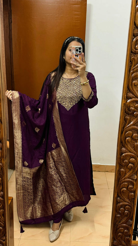 Embroidered silk suit set teamed up with pants and banarsi dupatta.